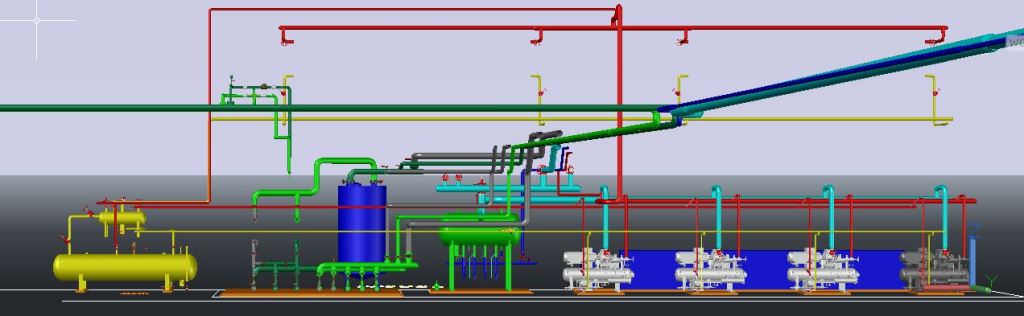 The cold generation center that contains: Compressors, Condensers, receiver tanks, thermosyphons, pumping tanks, pumps, pipes, purges, valves (ICF, REG, SVA, ICM, ICAD, NRVA, OFV, QDV, etc.). Then the liquid ammonia is pumped to the evaporators, and returns by suction as vapor to be compressed and raise its pressure to be sent to the condenser, which then goes down to the thermosyphon and receiver tank, and so the refrigeration cycle continues.